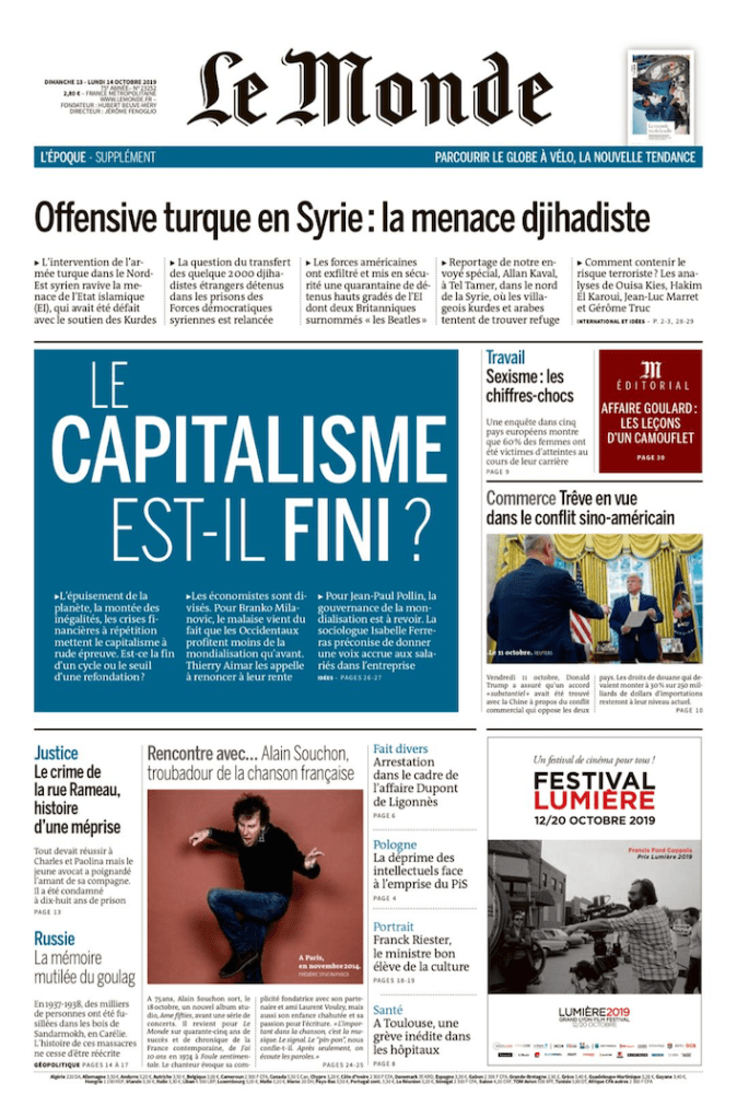 Le Monde, en ligne samedi 12 octobre 2019, édition : 13-14 octobre 2019, p. 27