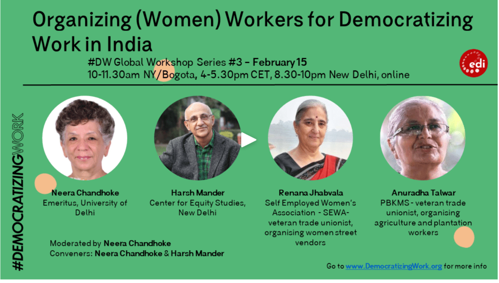 Speakers: Renana Jhabvala (Self Employed Women’s Association – SEWA-veteran trade unionist, organising women street vendors) and Anuradha Talwar (PBKMS – veteran trade unionist, organising agriculture and plantation workers) as panelists, and Neera Chandhoke (Emeritus, University of Delhi) as chair