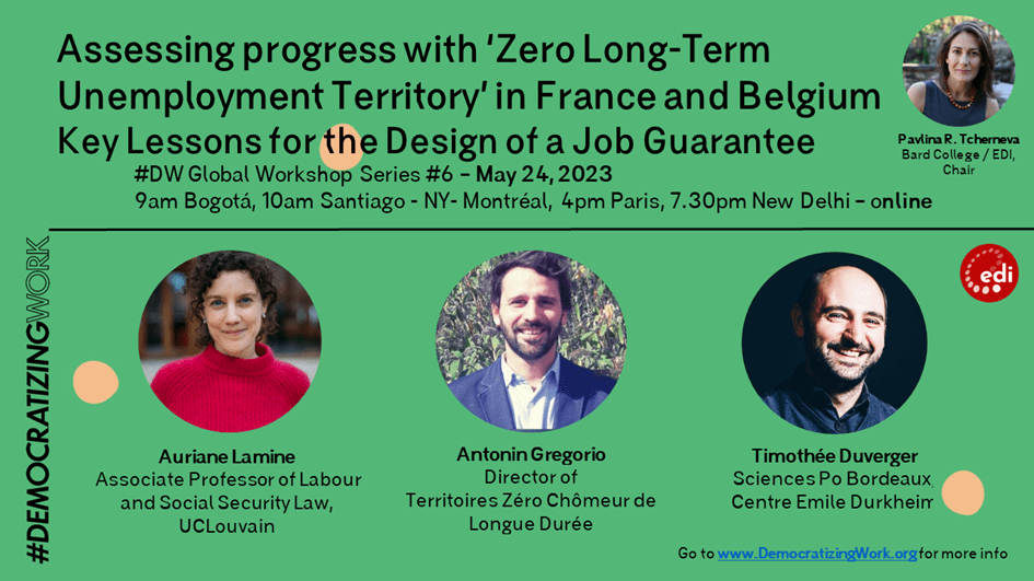 Speakers: Auriane Lamine (Professor of law at the University of Louvain), Antonin Gregorio (Director, Territoires Zéro Chômeurs de Longue Durée, France), Timothée Duverger (Professor at Sciences Po Bordeaux, Centre Emile Durkheim. President of the TZCLD Observatory)