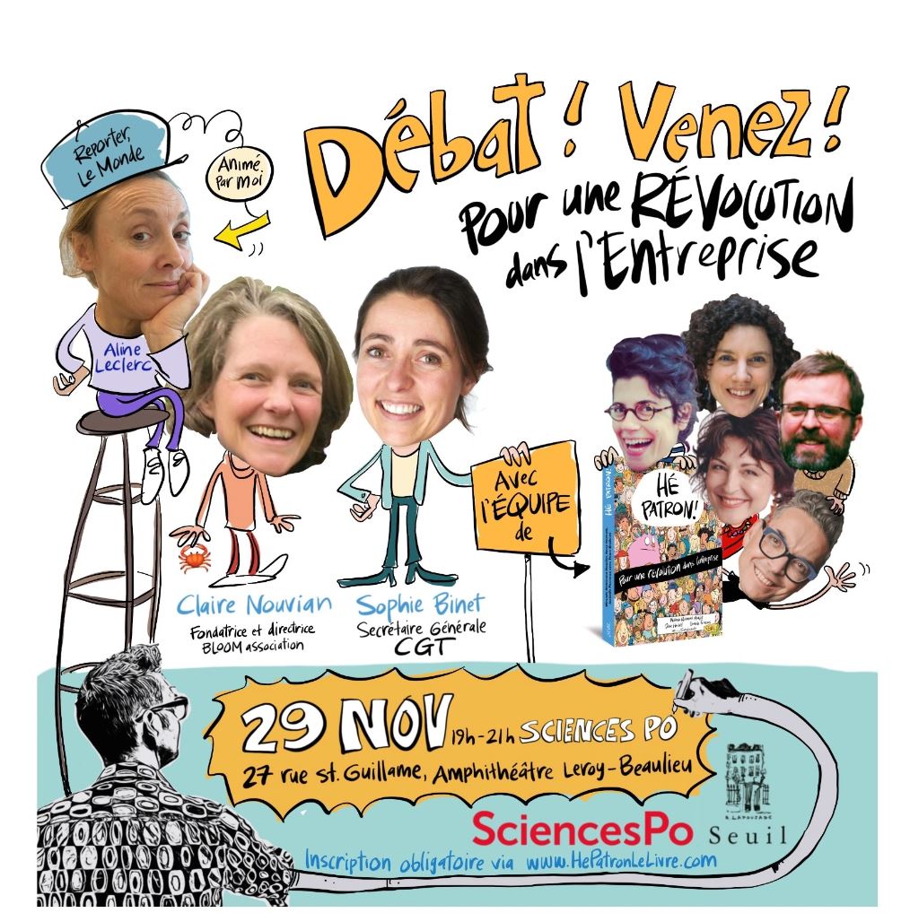 Débat animé par Aline Leclerc – Le Monde, avec Sophie Binet – Secrétaire Générale CGT, Claire Nouvian – Fondatrice et directrice BLOOM association, et l’équipe de « Hé Patron! »
