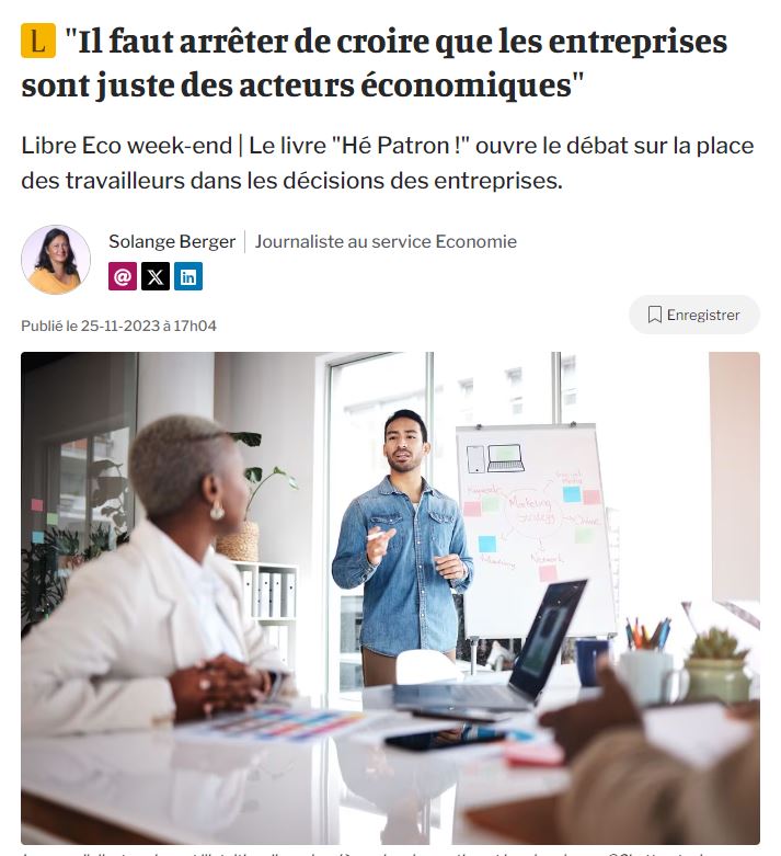 « Si, dans la vie de tous les jours, nous avons encore les moyens de peser sur notre destin, qu’en est-il dans l’entreprise ? Hé, patron, moi aussi je souhaite pouvoir donner mon avis ! : c’est sur ce postulat de départ qu’Isabelle Ferreras, sociologue du travail à l’UCLouvain et maître de recherche associée aux universités de Harvard et Oxford, a réuni onze experts internationaux (juriste, psychologue, sociologue, économiste, historien), afin de comprendre pourquoi les processus de décision au sein des entreprises ne sont pas davantage démocratiques, pourquoi les travailleurs n’ont pas leur mot à dire sur ce qui les touche dans l’organisation. »